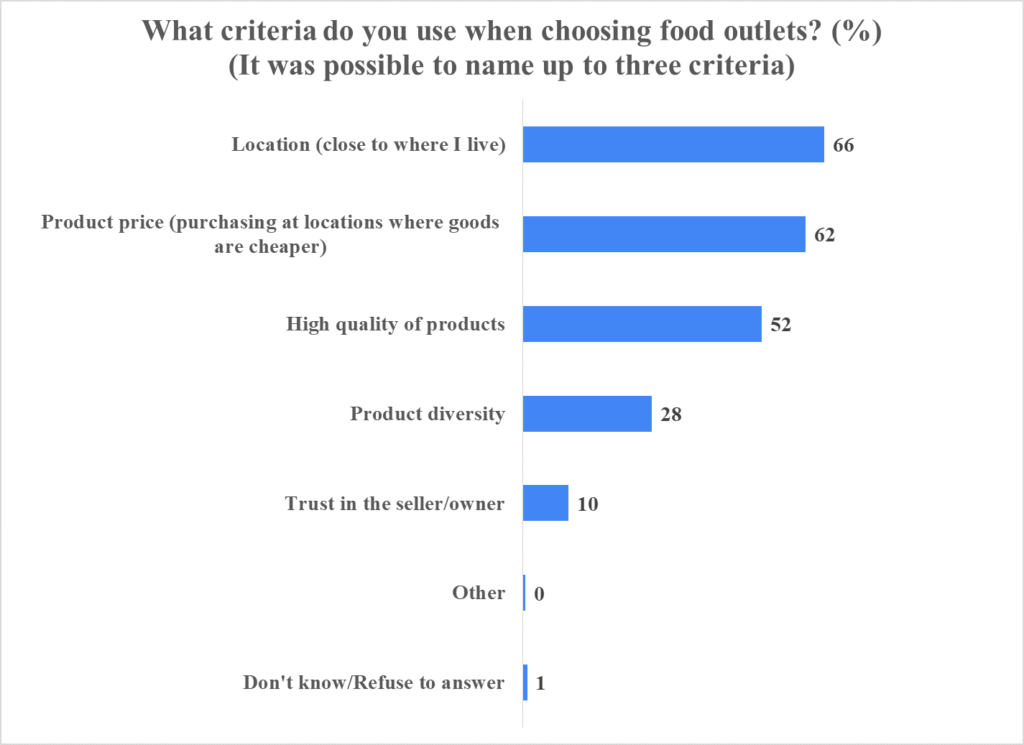 Women consumers choose food retail outlets based on three main criteria: location and proximity to their home (66%), product price (purchasing at locations where goods are cheaper) (62%), and high quality of product (52%). Product diversity is prioritized by 28% of respondents, while trust in the seller/owner is named by 10% (Figure 1).