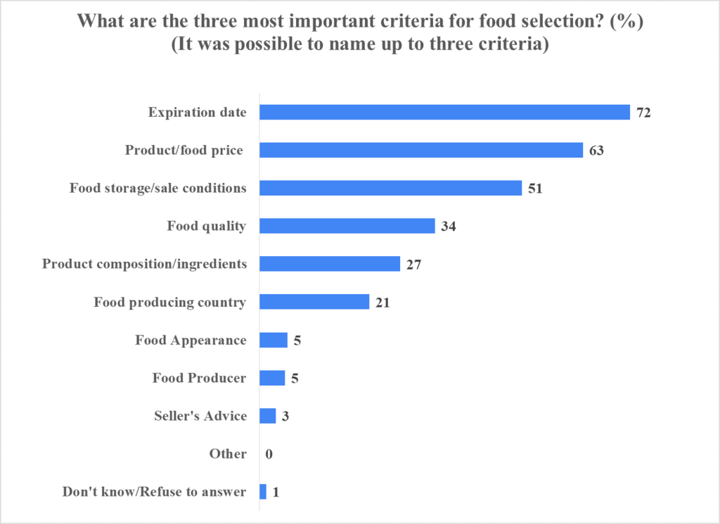 As for criteria for selecting food products, respondents identified the following: expiration date (72%), product/food price (63%), and food storage/sales conditions, such as hygiene and temperature (51%). In addition to these three main criteria, respondents also mentioned food quality (34%), product composition/ingredients (27%), and the country of origin of the product (21%) (Figure 2).