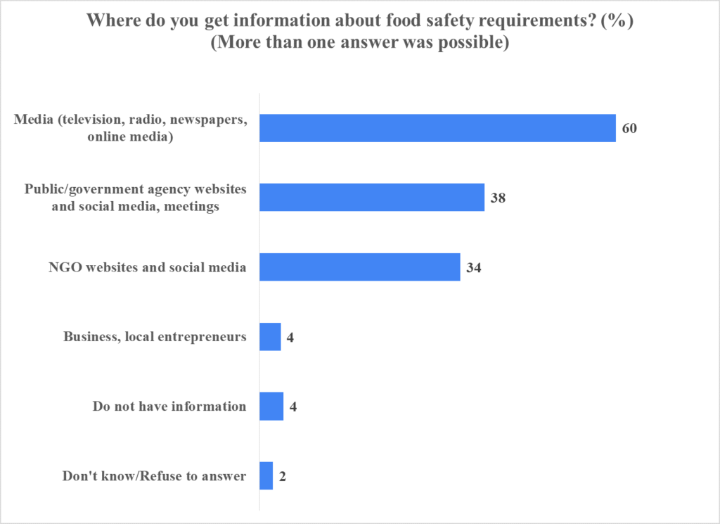 Citizens identify the media (television, radio, newspapers, and online media) as the main source of information related to food safety requirements (60%). In addition, a substantial portion of respondents (38%) use official websites and social media pages of public and state institutions to obtain information. This result indicates that communication produced by state structures does reach part of the public, though its scale and effectiveness is lower compared to the influence of the media. About one-third of respondents (34%) name non-governmental organizations’ resources as a source of information. This data shows that the potential of the civil sector in consumer education and awareness-raising is not being sufficiently utilized (Figure 3).