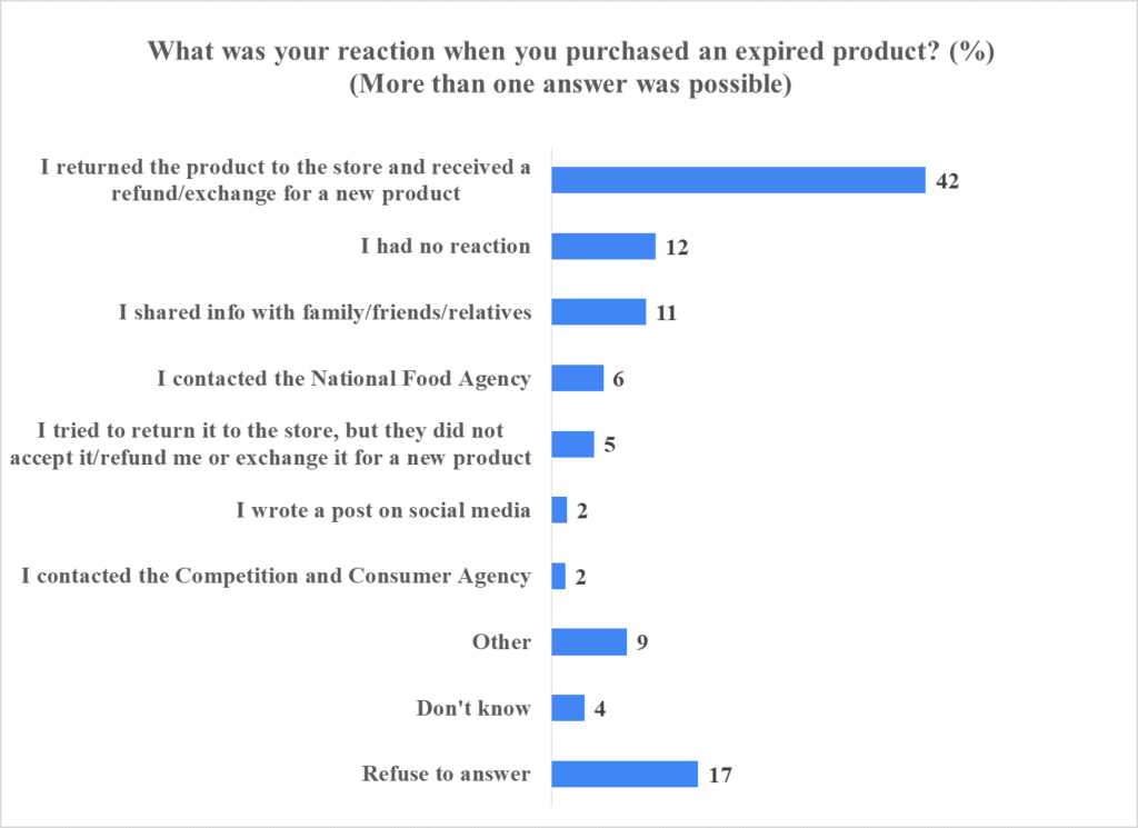 Notably, in response to the question, whether respondents have purchased an expired product during the past year, one-third (33%) answered positively. When asked about their reaction after purchasing an expired product, 42% stated that they returned the product to the store and received a refund or exchanged it for a new product. Twelve percent reported that they had no reaction at all, while 11% shared the information with family members, friends, or acquaintances. Only 6% contacted the National Food Agency, and just 2% contacted the Competition and Consumer Agency (Figure 4).