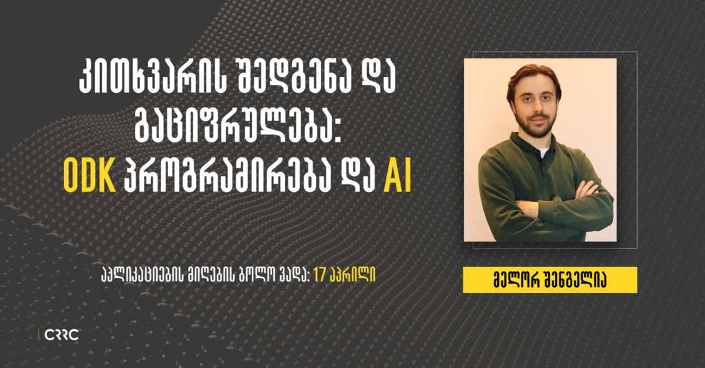 ლოკაცია: CRRC-საქართველოს ოფისი – 1 ლიზიკო ქავთარაძის ქ. შესასვლელი III-IV, პირველი სართული (ყოფილი ილია ჭავჭავაძის გამზირი #5)