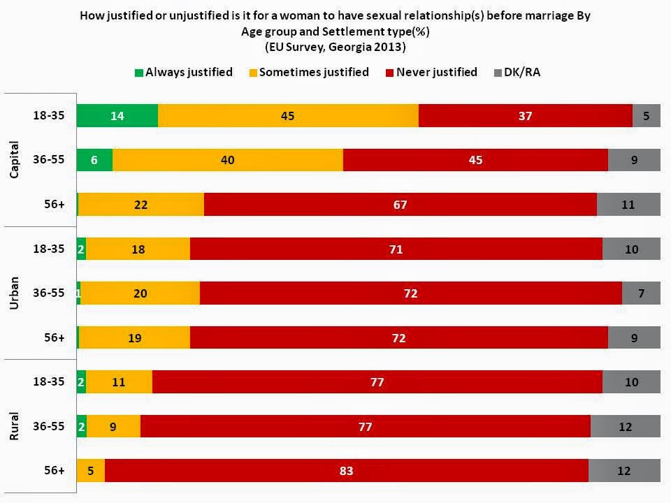 While dominant values, religion, and patriarchy engender many stereotypes about gender in Georgia, women also play an important role in maintaining them. A slightly higher percentage of women than men reported in 2011 that it is never justified for women to have premarital sex (70% and 58% respectively) while in 2013 and 2009 the percentages are almost equal.