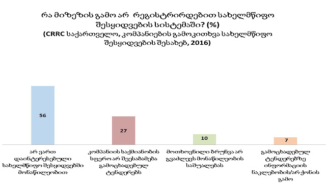 შენიშვნა: დიაგრამაზე ნაჩვენებია კომპანიების 83%-ის პასუხების განაწილება, რომლებსაც არ მიუღიათ მონაწილეობა სახელმწიფო შესყიდვებში. კომპანიები, რომელთა წარმომადგენელმაც შესაბამის კითხვაზე უპასუხა „უარი პასუხზე“, გამორიცხული არიან ანალიზიდან. საქართველოში სახელმწიფო შესყიდვების ხუთი ტიპი არსებობს: გამარტივებული შესყიდვა, გამარტივებული ელექტრონული ტენდერი, ელექტრონული ტენდერი, კონსოლიდირებული ტენდერი და კონკურსი. თითოეული მათგანის განმარტება იხილეთ აქ.