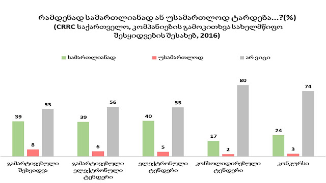 კომპანიების უმრავლესობას (64%-ს) არ აქვს ინფორმაცია სახელმწიფო შესყიდვების გამოცხადების შესახებ, ამიტომ გასაკვირი არ არის, რომ ინტერვიუების დროს მათ წარმომადგენლებს გაუჭირდათ პასუხის გაცემა კითხვაზე, თუ რამდენად სამართლიანად ან უსამართლოდ ტარდება, მათი აზრით, ტენდერის ესა თუ ის სახეობა. აღსანიშნავია აგრეთვე, რომ კომპანიების უმრავლესობას (76%-ს) არ სმენია იმ სემინარების შესახებ, რომელთა მიზანიც სახელმწიფო შესყიდვების საკითხებში კვალიფიკაციის ამაღლებაა, რაც კომპანიების უაღრეს არაინფორმიებულობაზე მიუთითებს შესყიდვებთან დაკავშირებული საკითხების შესახებ.