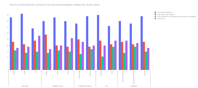 While in April, the public tended towards thinking that the worst was yet to come, in January people tended to report that the worst of the pandemic was behind us. The sense that the coronavirus was not going to be that large a problem declined in January compared with early October. Those with a higher education, women, people who have jobs, and younger people were more likely to think that the worst was behind us.