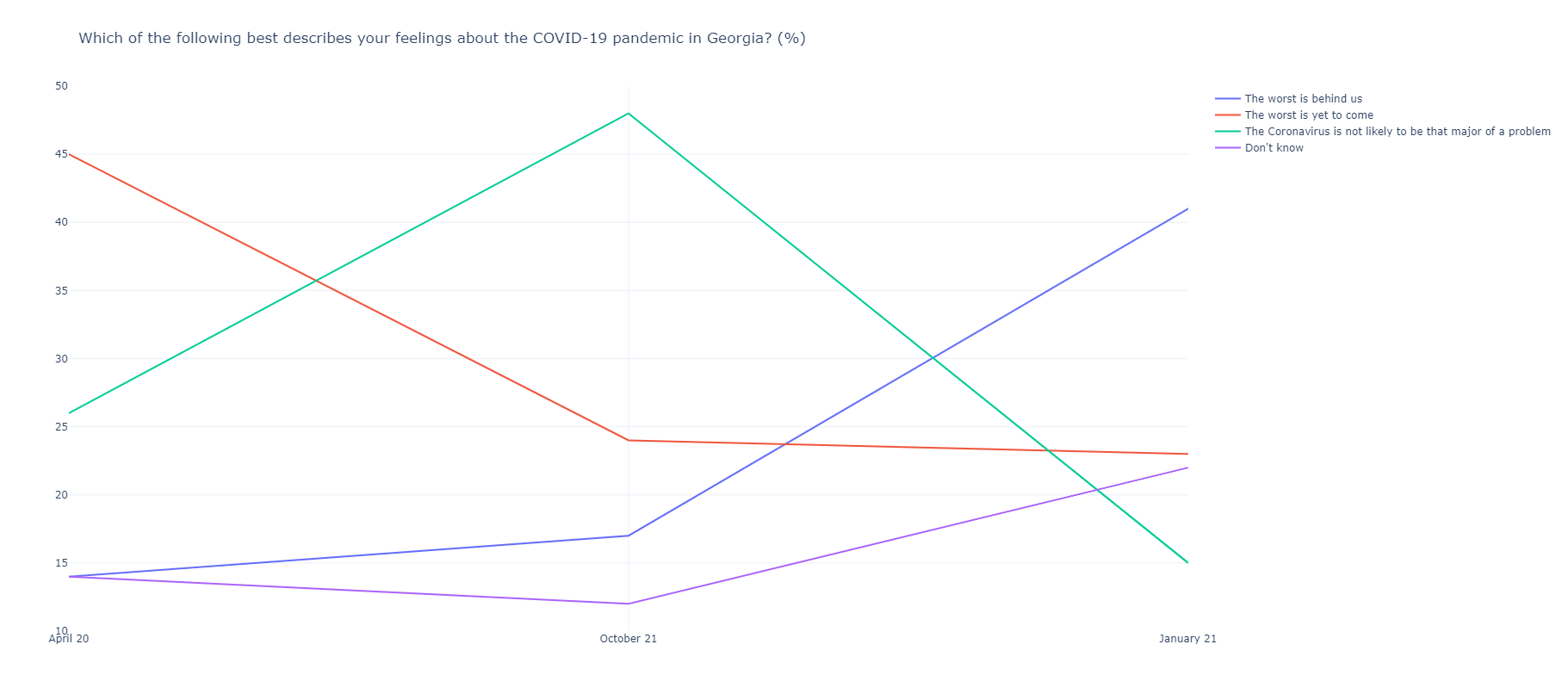 In April 2020, Georgia had low COVID-19 case counts. Given this as well as the difficult situations in other countries, it is perhaps unsurprising that 45% of the public believed that the worst of the virus was yet to come. At the same time, 26% thought that the virus would not be a major problem, and 14% thought that the worst had already passed.
