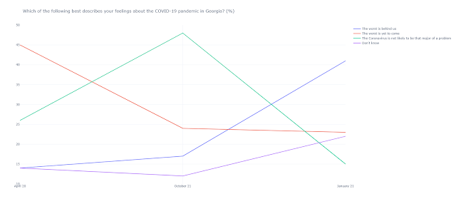 The data shows somewhat counterintuitive results in early October. Although case counts were rising quickly during the fieldwork period (6–16 October) and had been on the rise since September, the view of the plurality (48%) shifted to thinking that COVID-19 was not going to be a major problem. One potential reason for this pattern is that Georgia had experienced relatively few cases over the summer compared to the outbreaks witnessed internationally.