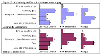 Given the central role that water, sanitation and hygiene conditions play in day-to-day life, it is unsurprising that IDPs rank these items below only income and jobs (approximately 90% of IDPs are unemployed) when assessing their greatest needs. The report identifies a number of serious problems, the most pressing of which is reliable access to water (necessary not only for drinking and bathing, but also cooking, cleaning, and operation of toilets). Furthermore, although the large majority of collective centers and villages had safe drinking water, 40% of new settlements did not have water that passed national standards.