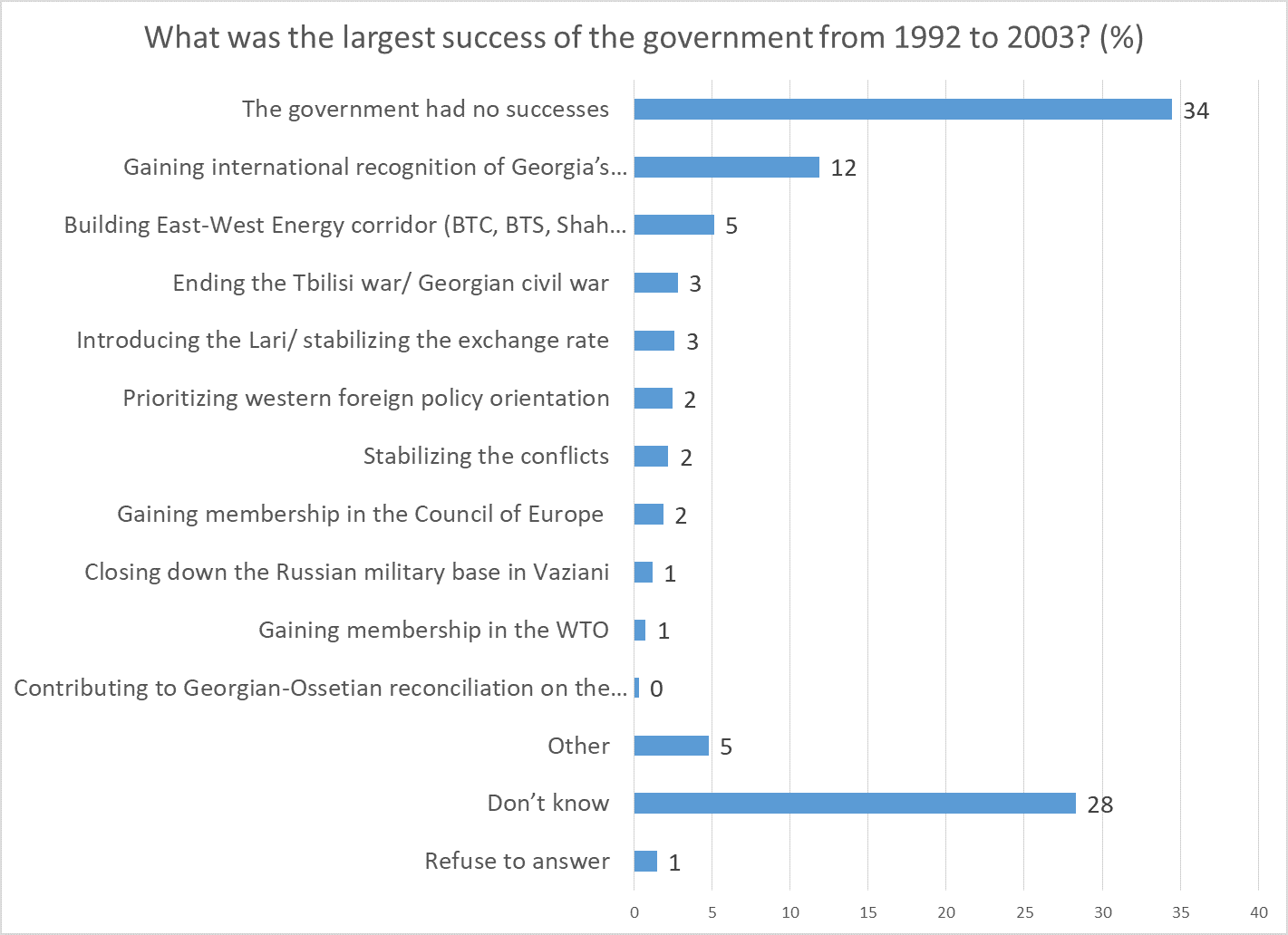 The data says relatively few people in Georgia have something nice to say about Shevardnadze: a third of the public reported they could not name a single success of his government. The second most common response was ‘don’t know’, suggesting less approbation than the previously noted response, but still a lack of a clear success coming to mind.