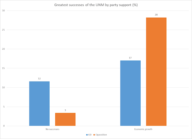 There were relatively few differences between the perceptions of Georgian Dream and UNM supporters in terms of the UNM’s greatest achievements, with one exception. Opposition supporters were more likely to view the UNM’s greatest success as economic growth while, Georgian Dream supporters were more likely to report that the UNM had no successes.
