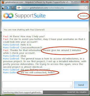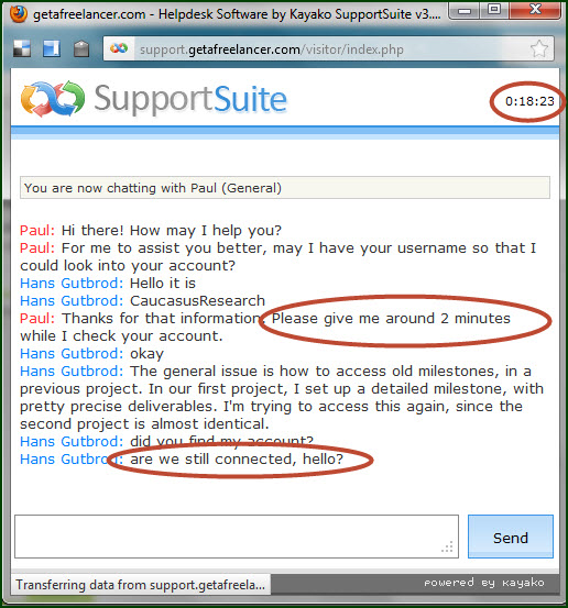 Freelancer.com does have support, but it doesn’t work for you. Several times I received no response. When persisting (because I wanted access to deliverables I had set), I was told to wait “around 2 minutes”, and more than 15 min. later I still hadn’t heard back (see below). I then was instructed to read their FAQs on issues even though clearly the website didn’t work. 50 minutes later I was still online with support giving me intermittent attention, still trying to find a fix for a very basic problem. And in the end, when they couldn’t fix the problem – they just threw me out of their support line and terminated the conversation.