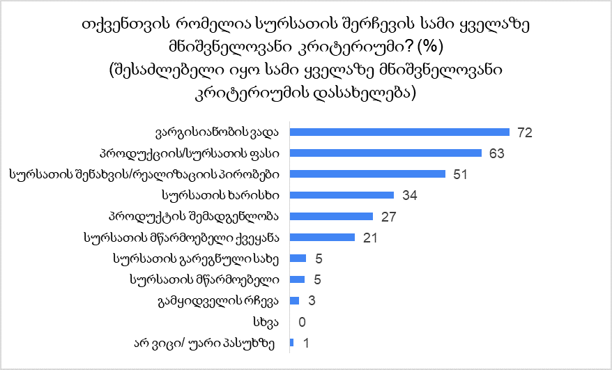რაც შეეხება სურსათის შერჩევის კრიტერიუმებს, რესპონდენტებმა დაასახელეს: ვარგისიანობის ვადა (72%), პროდუქციის/სურსათის ფასი (63%), და სურსათის შენახვის/რეალიზაციის პირობები, როგორიცაა ჰიგიენა და ტემპერატურა (51%). ამ სამი ძირითადი კრიტერიუმის გარდა, რესპონდენტებმა დაასახელეს სურსათის ხარისხი (34%), პროდუქტის შემადგენლობა (27%) და სურსათის მწარმოებელი ქვეყანა (21%) (დიაგრამა 2).