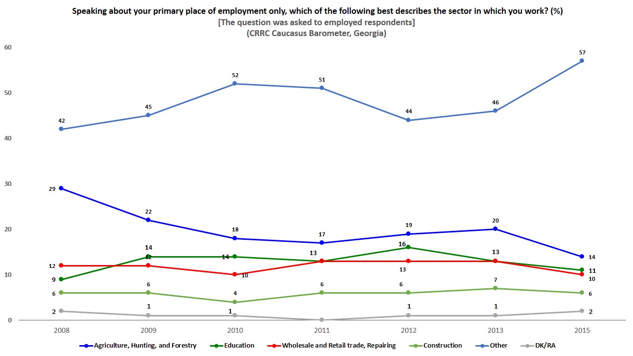 According to CRRC’s Caucasus Barometer (CB) surveys from 2008 to 2015, the self-reported employment rate is rather stable in Georgia – approximately 35%. This blog post looks at the trends in CB data on primary employment sector and type of primary workplace. Throughout the post, only the answers of those who reported being employed – slightly above a third of the population – are analyzed.